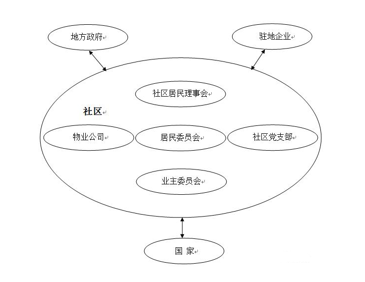無論是政府職能視角,還是多元行動(dòng)體、社區(qū)自治的視角,都是就網(wǎng)格化建設(shè)討論公共組織與社區(qū)的關(guān)系。這就涉及到以政府為主的公共部門如何處理與社區(qū)的關(guān)系、社區(qū)內(nèi)部如何管理以及如何提高自治能力,具體表現(xiàn)為政府“自上而下”的權(quán)力下放和街道社區(qū)“自下而上”的利益訴求,這實(shí)際上就是對(duì)公共部門與社區(qū)“合作、協(xié)商、伙伴關(guān)系”的思考和實(shí)踐。從微觀上看,社區(qū)網(wǎng)格化管理從內(nèi)容上必須涵蓋社區(qū)黨建、社區(qū)管理、社區(qū)服務(wù)、社區(qū)教育、社區(qū)衛(wèi)生、社區(qū)經(jīng)濟(jì)、社區(qū)文化、社區(qū)環(huán)境保護(hù)等。社區(qū)內(nèi)的權(quán)力載體有居民委員會(huì)、社區(qū)黨支部、物業(yè)公司、業(yè)主委員會(huì)、社區(qū)居民理事會(huì),涉及到的關(guān)系包括社區(qū)與地方政府、駐地企業(yè)、國(guó)家之間的關(guān)系等。社區(qū)內(nèi)外關(guān)系如圖所示: